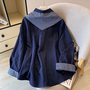 十三行高货爆款~新款飘带蝴蝶结衬衫女白色格子上衣拼接宽松衬衣