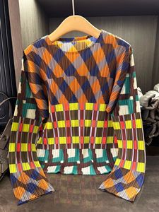 小众设计感网格印花撞色圆领T恤秋季新款气质休闲宽松版褶皱上衣
