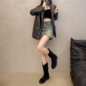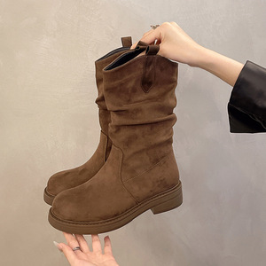 粗跟时装靴子女秋冬款复古短靴废土风褶皱感堆堆靴中筒绒面马丁靴