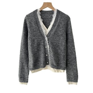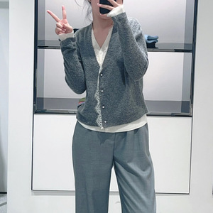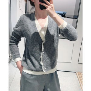 现货 鄂系风女装2025秋季新款灰色V领蕾丝花边钻扣装饰针织衫毛衣