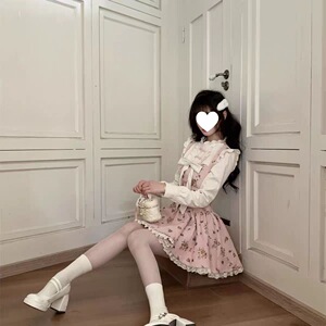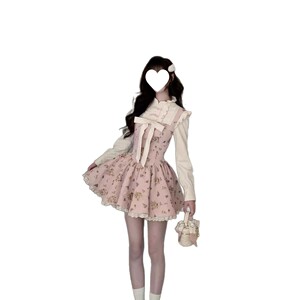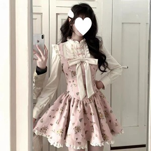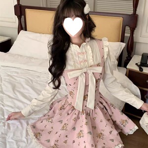 新中式复古粉色碎花连衣裙女春季新款蝴蝶结设计感收腰显瘦公主裙
