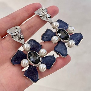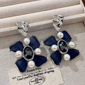 褶皱金属深蓝花朵蝴蝶耳环(S925银针)