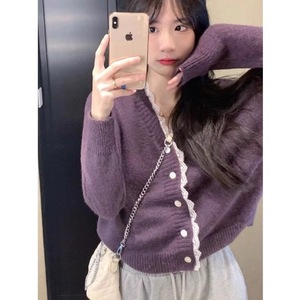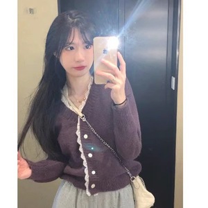 秋季短款毛衣女设计感蕾丝开衫外套宽松慵懒温柔风针织上衣女长袖