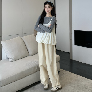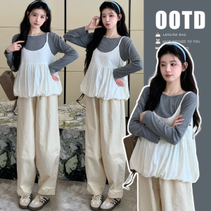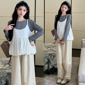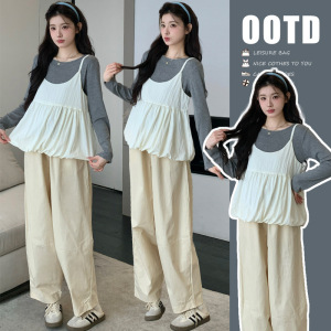 孕妇装早秋新款韩系打底上衣+花苞吊带衫+宽松休闲阔腿裤甜美套装