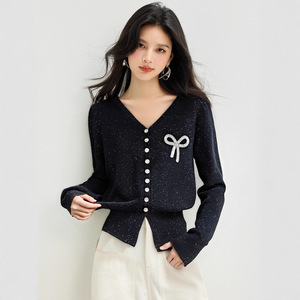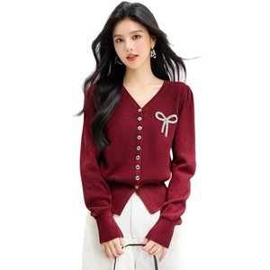 法式小香风红色V领针织上衣女早秋穿搭蝴蝶结设计感毛衣开衫外套