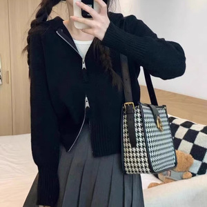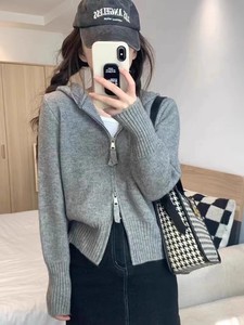 100纯羊毛针织开衫女式连帽双拉链外套修身显瘦韩系风短款外搭潮