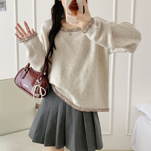 韩系花边圆领亮丝套头毛衣女2025秋冬新款宽松纯色百搭慵懒针织衫