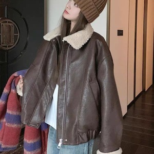 美拉德复古皮衣加绒加厚短款羊羔毛外套女冬2025新款宽松机车夹克