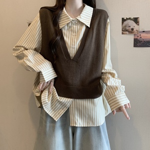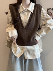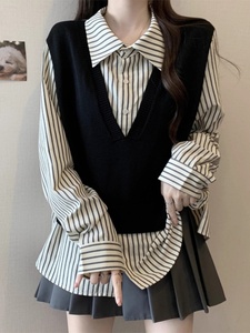 设计感假两件条纹拼接正肩衬衫女春秋大码胖妹妹学院风Polo领上衣