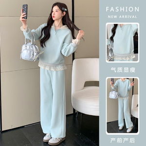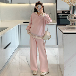 孕妇秋季新款韩版宽松休闲拼接蕾丝花边连帽卫衣休闲卫裤甜美套装