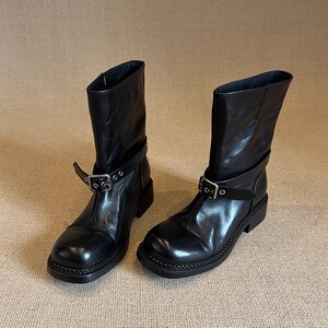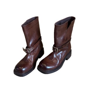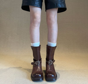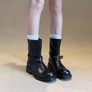 牛皮版~高级感厚底马丁靴女靴秋冬新款皮带扣大头皮鞋粗跟中筒靴