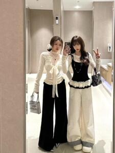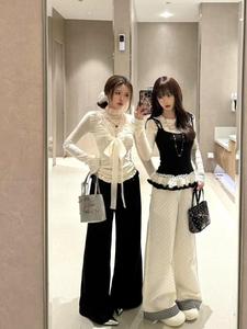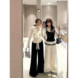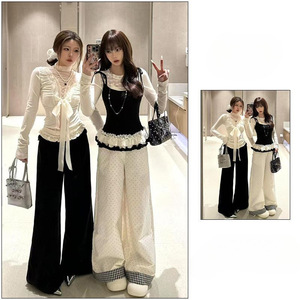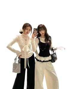 套装女2025秋季新款甜美假两件花边蕾丝吊带针织衫高腰波点阔腿裤
