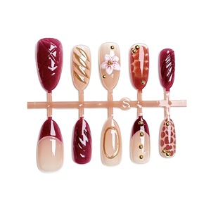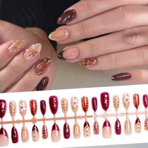 跨境爆款3D立体花朵鎏金穿戴甲法式棕红色美甲贴片批发短款杏仁型