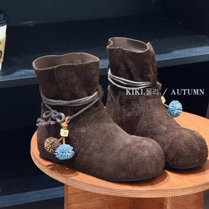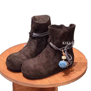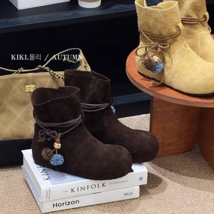 时尚流苏蝴蝶结粗跟短靴女2025秋冬复古风新款绒面气质百搭时装靴