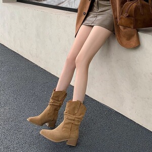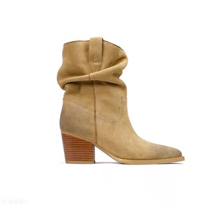 网红同款~粗跟西部牛仔靴微擦色复古时装靴显瘦粗跟尖头堆堆靴女