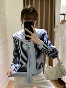韩女穿搭!秋季新气质百搭真两件羊毛混纺软糯条纹针织毛衣披肩女