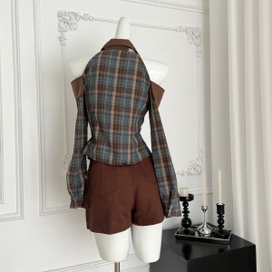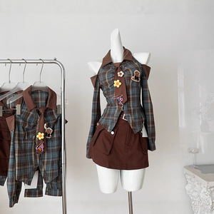 Q3789修身小个子甜酷风露肩格子衬衫女早秋复古格纹开衫学生潮流