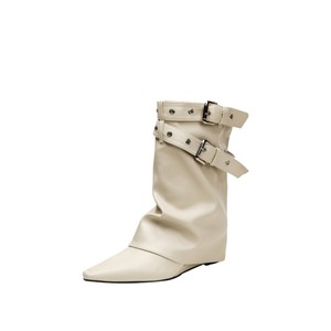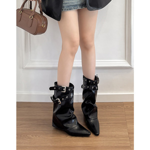 2025秋冬新款白色辣妹铆钉尖头裤管靴女骑士靴中筒堆堆靴短靴