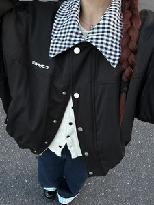 美式拼接翻领黑色短款外套女早秋季2025年新款宽松休闲夹克棒球服