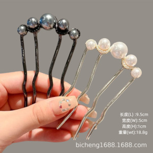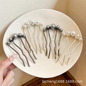 珍珠u型发簪高级感发钗古风丸子头珍珠四齿插梳盘发钗神器头饰