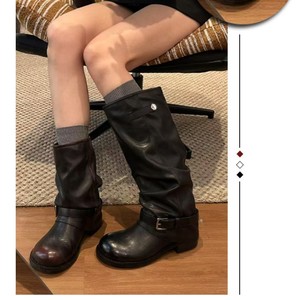 黑色圆头西部牛仔靴粗跟短学复古内增高骑士靴堆堆鞋复古E网情深