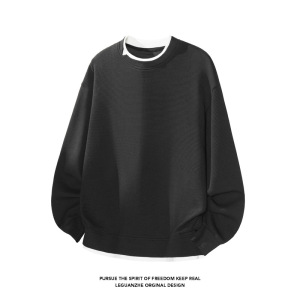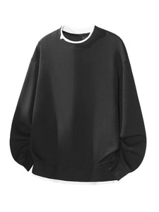 复古圆领长袖卫衣男秋高街假两件宽松打底衫潮牌纯色休闲情侣上衣