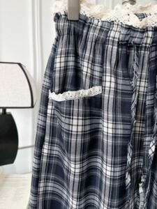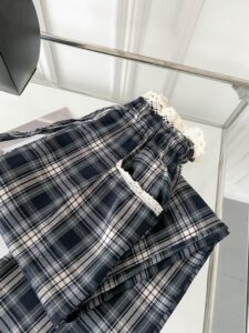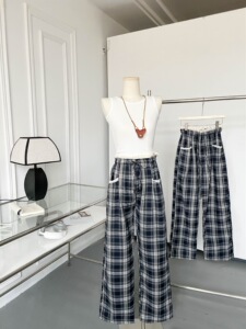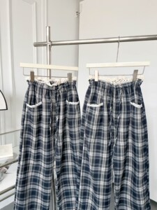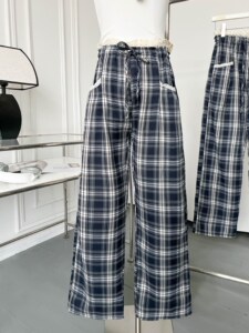 【实拍】显瘦灰蓝格子休闲裤百搭拼接腰头抽绳阔腿裤宽松直筒长裤