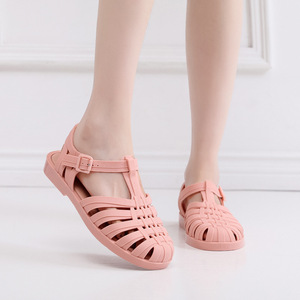 新款夏季凉鞋时尚复古编织罗马外穿百搭塑料镂空搭扣果冻
