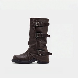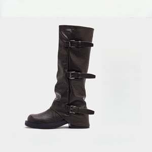 速鼎家!葡萄妈同款增高6cm时髦皮带扣方圆头褶皱中筒骑士靴女秋