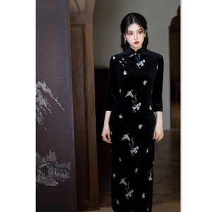 复古中国风长款丝绒绣花七分袖旗袍2025初秋新款感日常旗袍裙