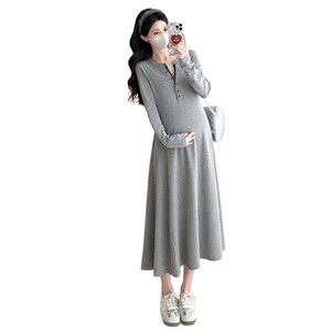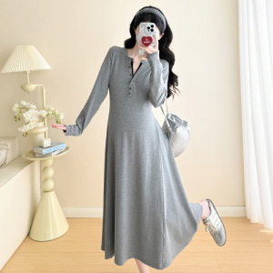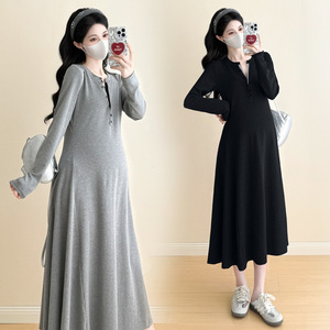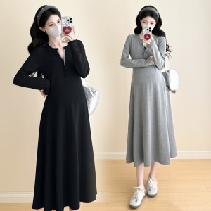 孕妇装秋冬季潮妈时尚新连衣裙怀孕期高级感减龄显瘦开扣哺乳裙子