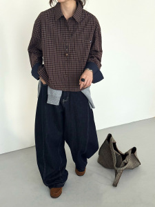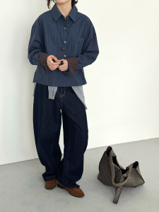 黎诺早秋新款韩系通勤刺绣格子衬衫女2025设计感撞色短款上衣开衫