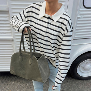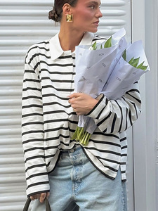 秋冬新款宽松百搭条纹翻领长袖T恤女设计感气质休闲2025跨境通勤