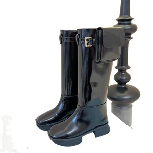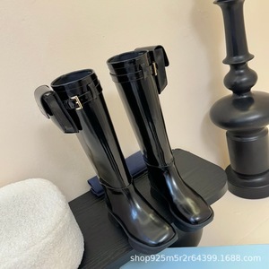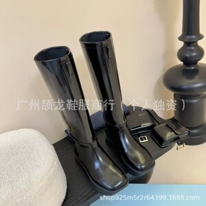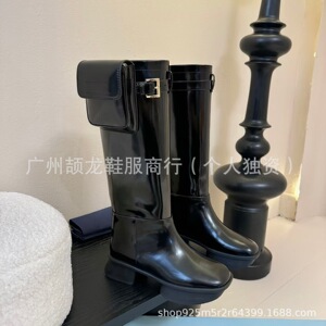 高端2025秋冬三角标欧美时尚真皮圆头包包搭扣厚底高筒骑士靴长靴