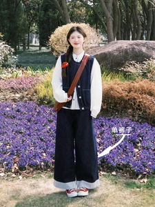 初秋穿搭一整套大码胖mm日系文艺衬衫马甲阔腿裤减龄叠穿三件套装