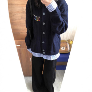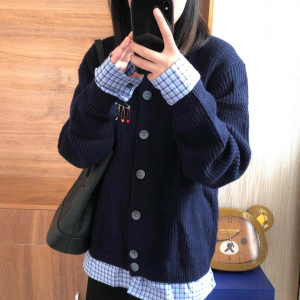 设计感格子拼接慵懒风复古别针假两件针织衫外套女秋冬毛衣开衫潮