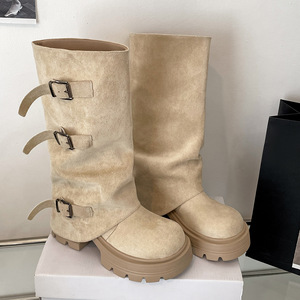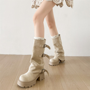 白色复古爆款厚底靴子女长筒靴2025新款秋季配裙子显瘦骑士长靴子