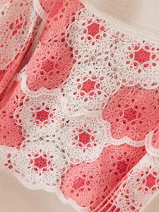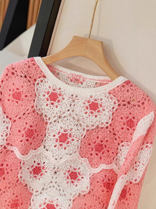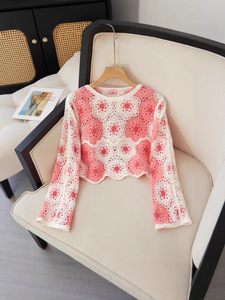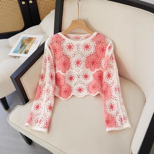 韩系甜美拼色钩针罩衫 短款镂空长袖针织上衣 女装早秋新款批发