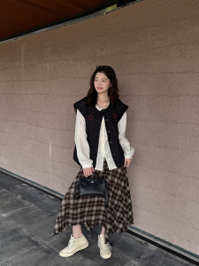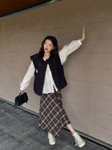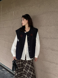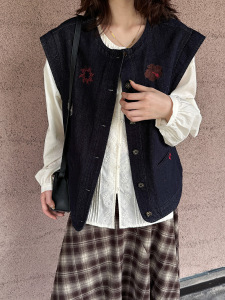 黎诺早秋新款韩系刺绣拼格牛仔马甲女2025设计感时尚洋气无袖外套