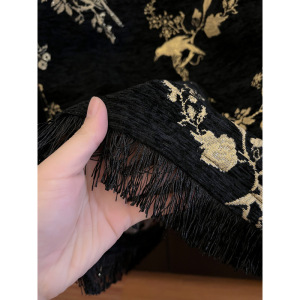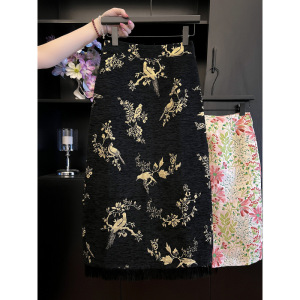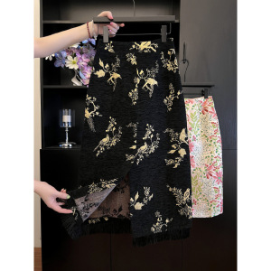 雀鸟织金提花雪尼尔复古刺绣半身裙女秋冬开叉流苏中长款A字裙