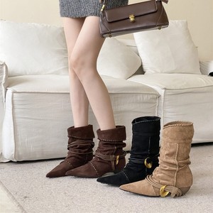 2025尖头磨砂短靴女增高褶皱两穿小众磨砂复古猫跟西部牛仔堆堆靴