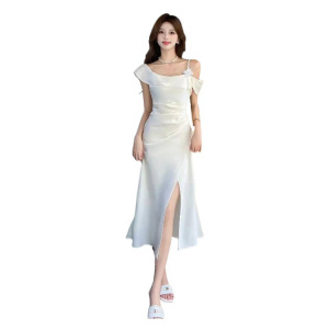 跨境2025设计感立体花朵斜肩优雅气质显瘦开叉缎面连衣裙