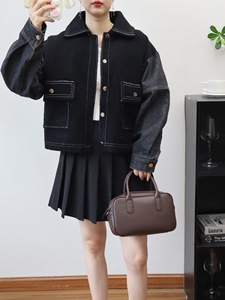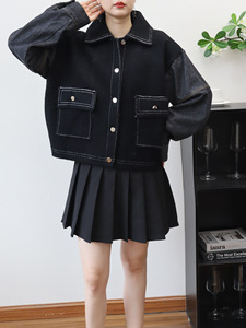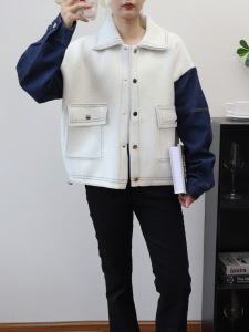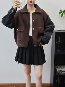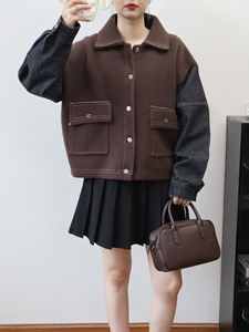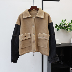 2025秋冬新款拼接牛仔针织双面呢开衫宽松休闲设计感毛衣外套女潮