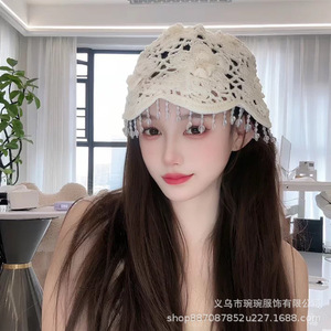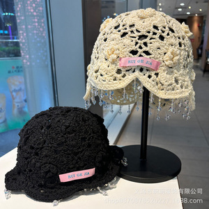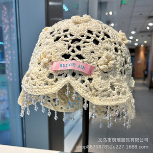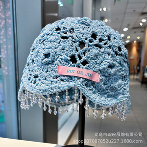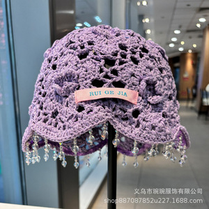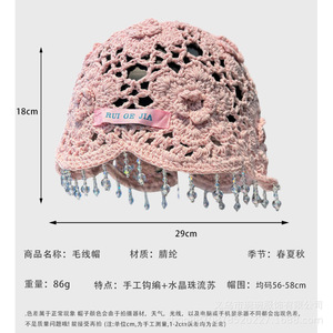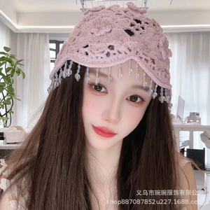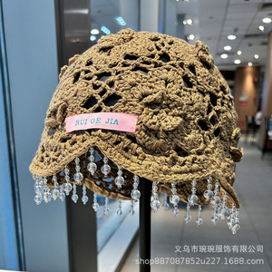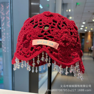 波西米亚风手工针织包头毛线帽女春秋季透气镂空显脸小流苏套头帽
