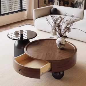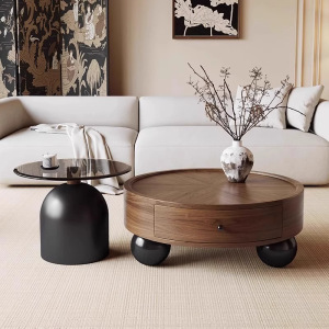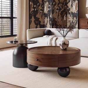 中古风实木茶几组合轻奢高级感复古家用小户型圆形茶几桌2025新款