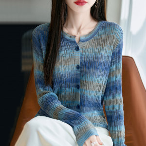 【厂家直供】时尚条纹圆领针织开衫外套女秋季薄款外搭毛衣针织衫