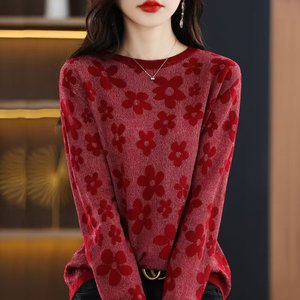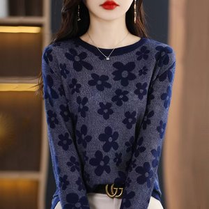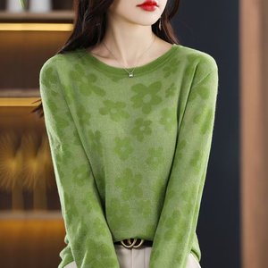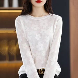 秋季新款精纺羊毛蕾丝花朵欧根纱圆领薄款长袖提花针织衫上衣女