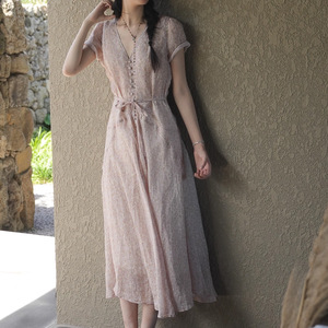 Ginger仲夏夜之梦 浪漫连衣裙 绿豌豆与紫桔梗度假风雪纺长裙