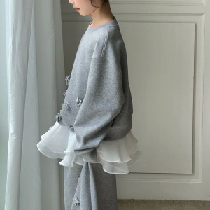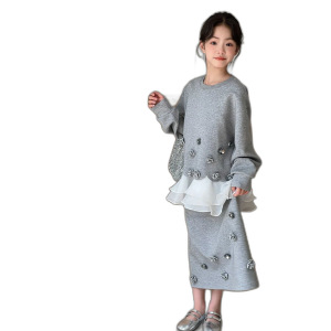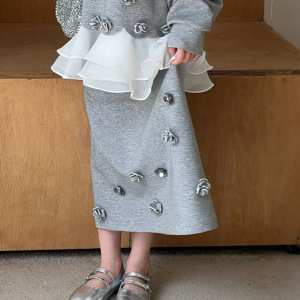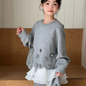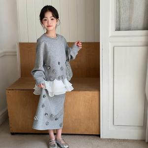 女童套装儿童卫衣半身裙春秋季2025新款大童灰色高端碎花两件套薄