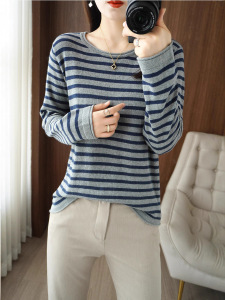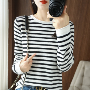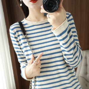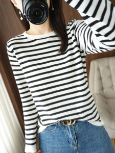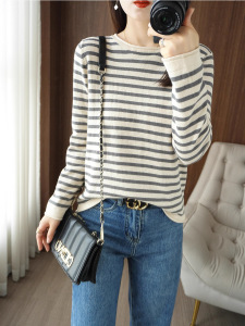 秋季新款女撞色条纹卷边圆领纯棉线毛衣针织衫简约修身减龄打底衫
